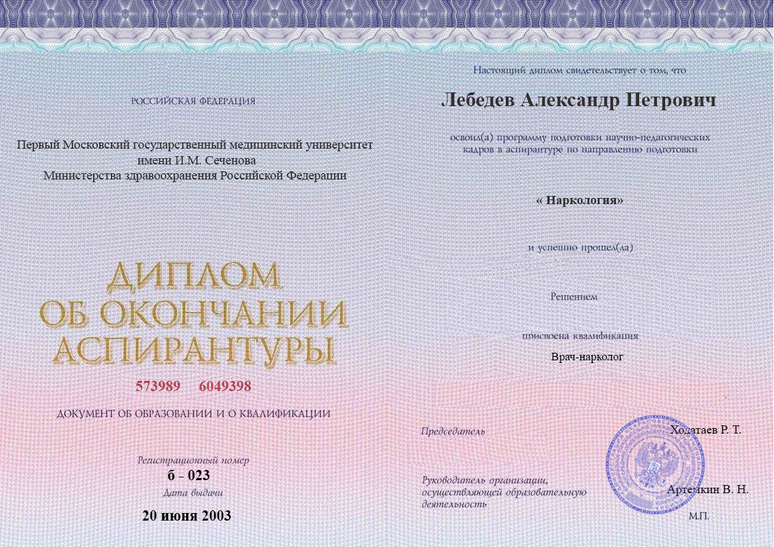 Диплом об окончании ординатуры Лебедева Александра Петровича